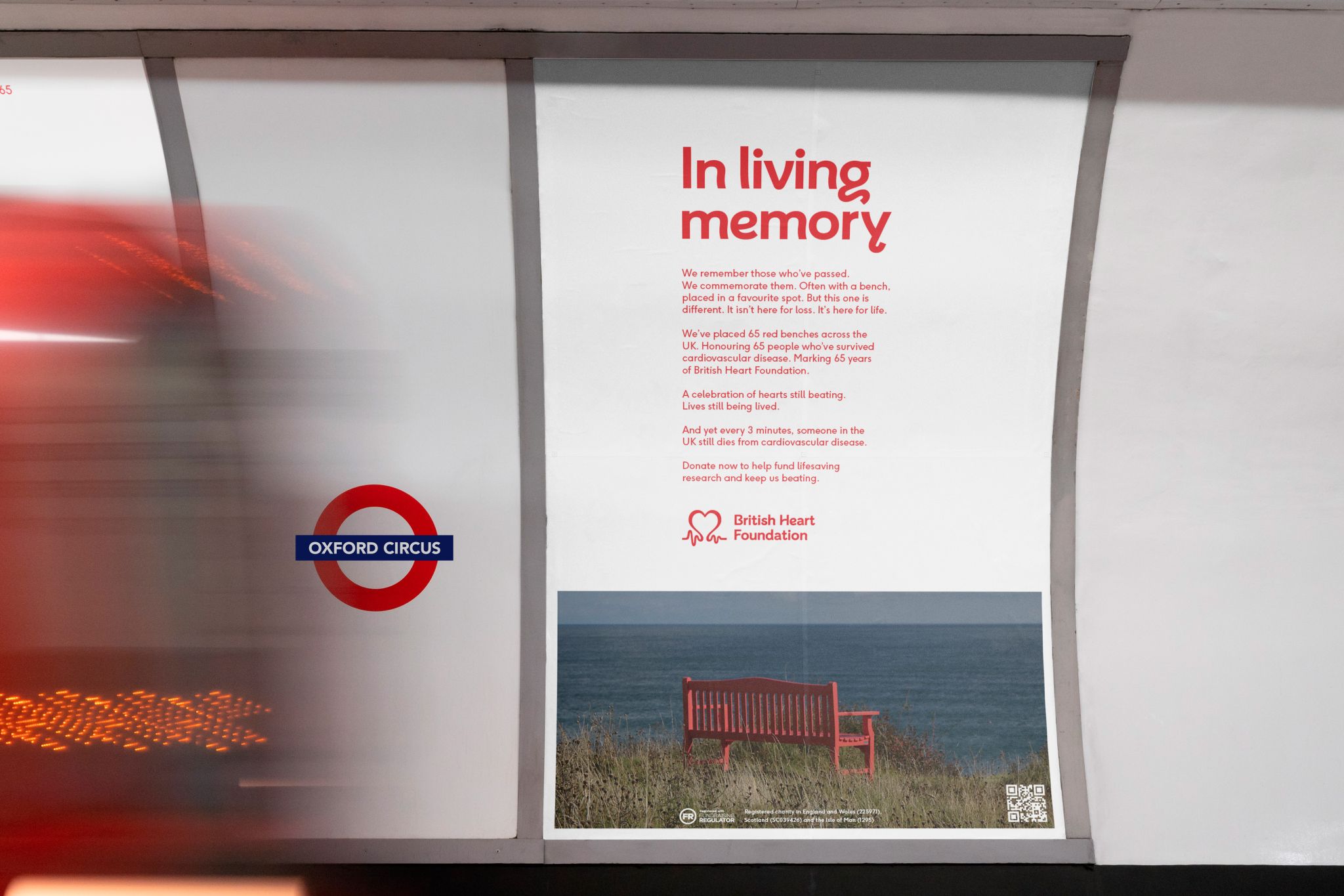 We permanently placed 65 red benches across the UK. Honouring 65 people who’ve survived heart disease. Marking 65 years of lifesaving scientific research funded by British Heart Foundation. Benches. Not in loving memory. In living memory. Each one installed in the hometown of our survivors and complete with a unique plaque dedicated to the life they're still living. All thanks to scientific research funded by BHF. The idea started with the amazing junior team Hannah & Lucy. Together with my creative partner, Becca, and CD's Pete & Ollie, we all brought this mammoth campaign to life. Teamwork makes the dream work.